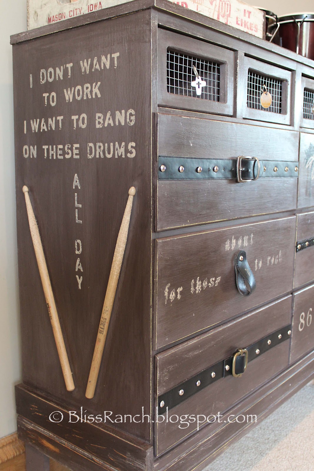 Oh my gosh! Bliss you are so creative! That is one of the coolest dressers I've ever seen! I am in awe. I love the drumsticks on the side and what you wrote there!