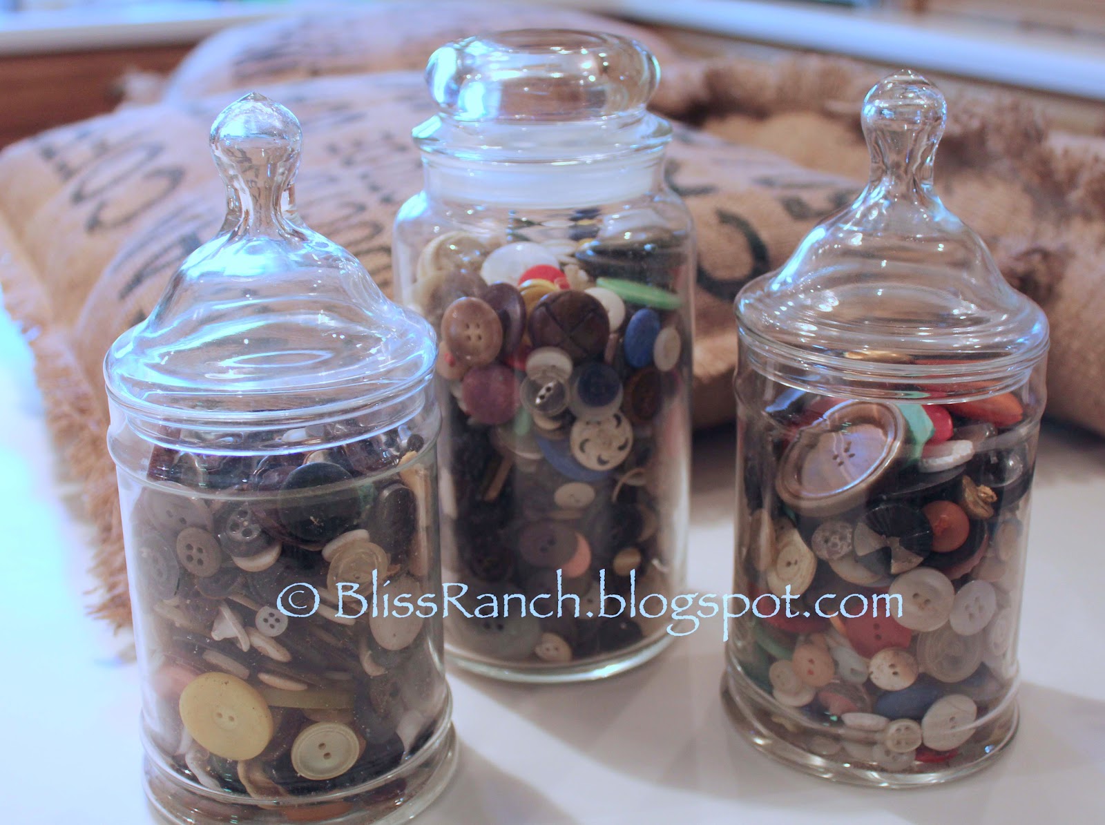 At the beginning of the week I glued them, but it wasn't working and that's when I borrowed the sewing machine. I stitched all the way around them and just frayed the burlap when I was done for a fringe. I was actually amazed at how I was able to get the pillow in nice and snug. I thought they needed something so I went through some jars of buttons that I've had for 25 years. I bought them in plastic bags at a garage sale from an old lady who saved them for years, so some could be I don't know how old!