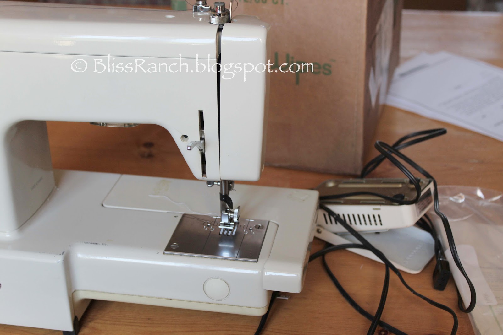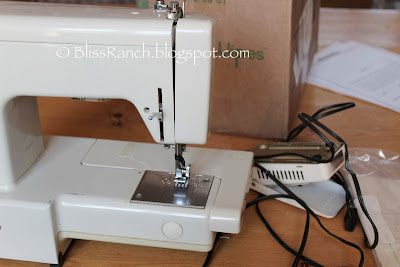 First thing I had to do was borrow a sewing machine. This one worked like a charm even though it clearly isn't a new model. I got out the directions to thread it, and it was like reading Greek to me, but it was sort of like riding a bike.... I got right on and went back to home-ec class 40 years ago. I also prayed the already loaded bobbin held out. It did. The lady who sold the machine to my daughter in law had her name on the instructions. Florence. Florence also had her name on the foot pedal and machine.