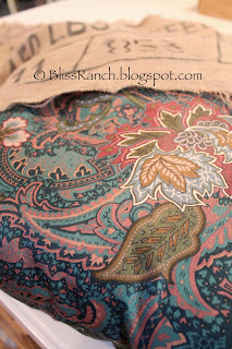 I had all those burlap sacks left from my breakfast nook valance making task, and I have seen all those amazing pillows you ladies make from burlap. I was fairly confident I could sew a straight line. I took some teal paisley pillows, (don't be jealous) and just cut the burlap bigger than them and stuck it inside, paisley and all.