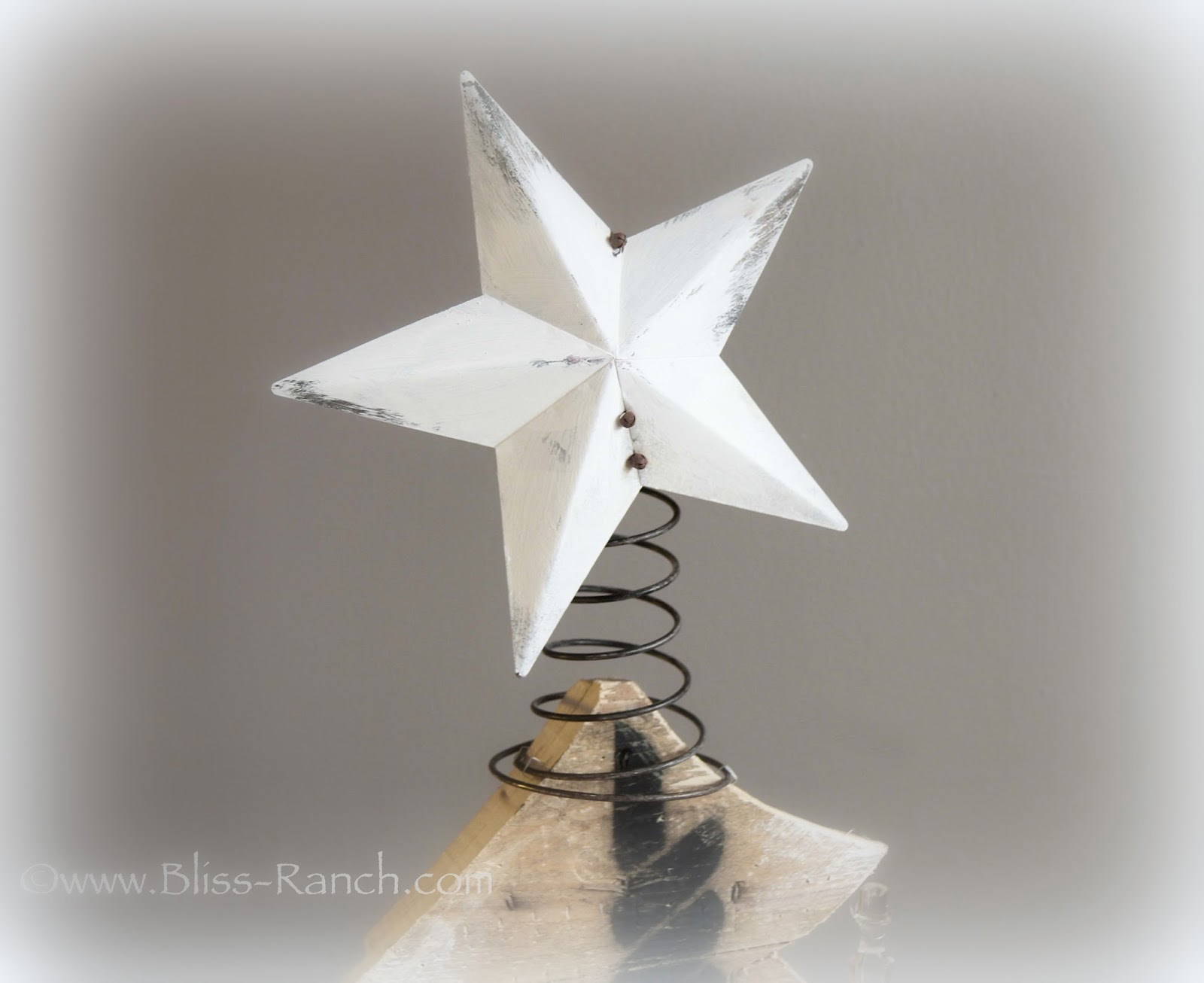 An old bed spring is stapled to the tree top and the star is wired on. I left the little bells on, because like I said, I was making this up as I went.